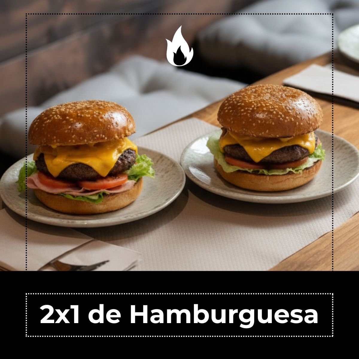 Hamburguesa 2x1 ¡Paga una y llevate dos! Viene completa con queso cheddar, jamón, tomate, lechuga y huevo frito. ¡Imperdible! Descarga el cupón